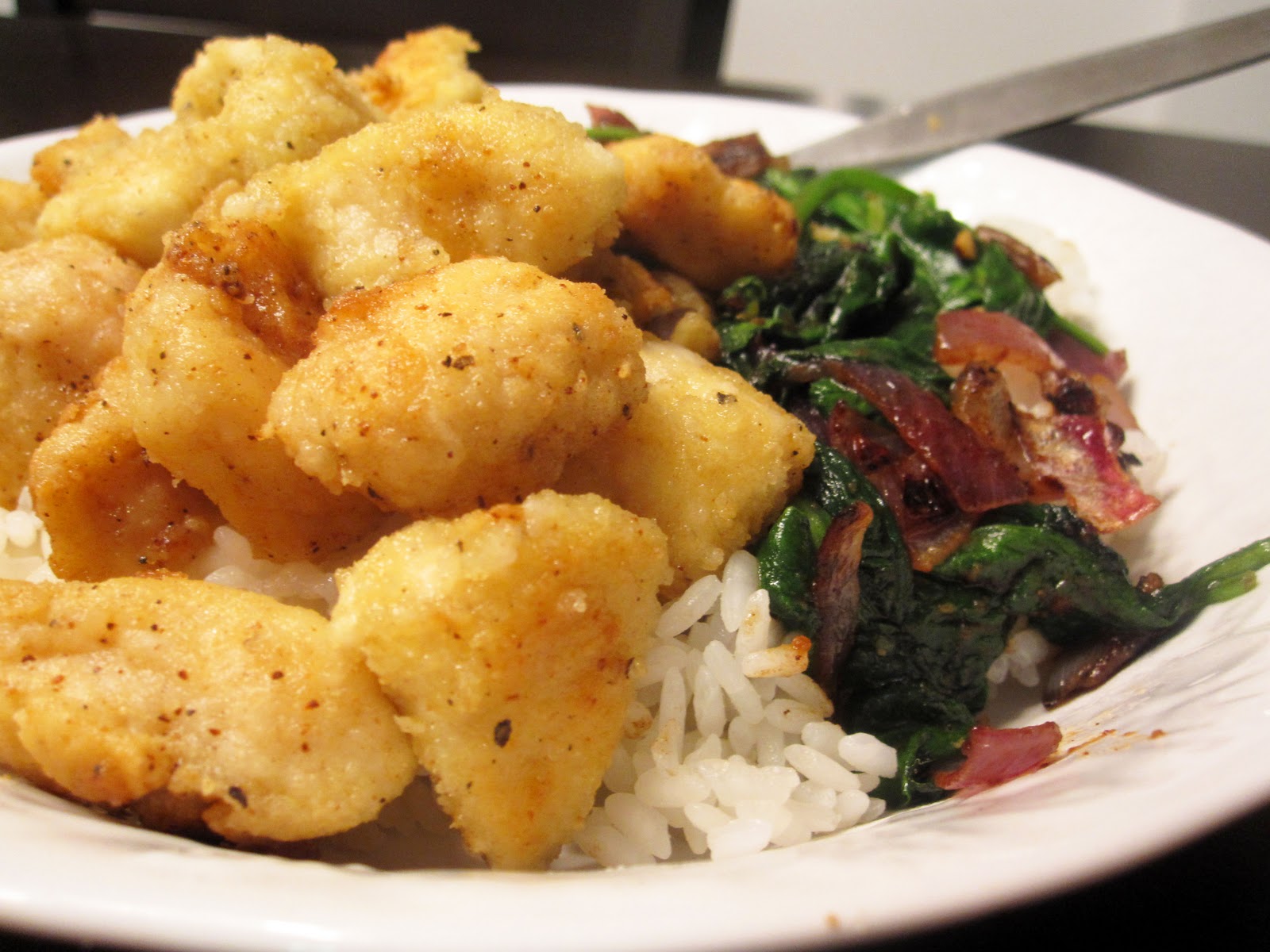 None of the recipes I found online seemed quite right, so I winged it. I chopped up a couple boneless chicken breasts into bite-sized pieces, dredged them in a flour/salt/pepper/garlic powder mixture, and pan-fried them in some olive oil. Result? Delicious! But not all were as crispy as they should be. I over-crowded the first batch in the pan, and the chicken took a long time to crisp up, and even then not by a whole lot. The second batch had room to breathe, and they not only cooked all the way through more quickly, but were also wonderfully crispy. Dan was a happy camper!
