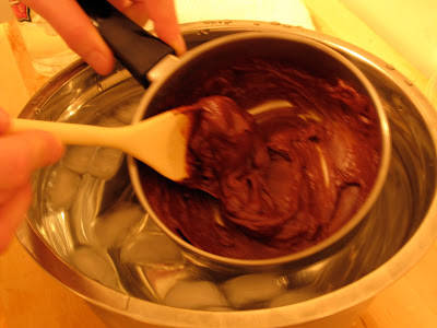 Holy blurry picture! Sorry about the picture quality, but that’s the only action shot I have of Dan helping me make the frosting. It was a little more complicated than I expected — we had to melt the chocolate, mix in butter tbsp by tbsp, then slowly stir the mixture in an ice bath until it reached a spreadable consistency. I can’t say I’ve ever made frosting this way, but I’ll be damned if the ice water didn’t actually turn the liquid chocolate into rich, thick frosting. Food science is a wonderful thing.