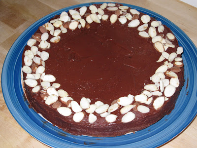 Technically the almonds are supposed to be brushed along the sides of the cake, but my cake turned out a little stumpy-er than Julia’s, and I just didn’t think that the nuts would reach their decorative potential that way.  I thought the cake was pretty like this too.