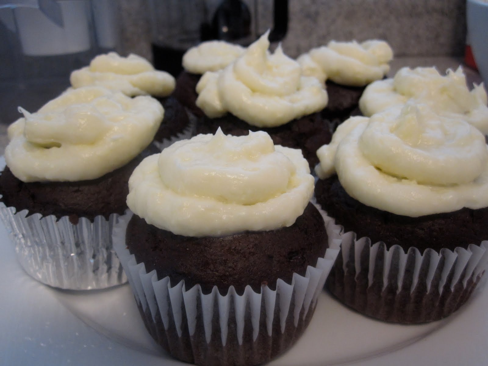 And cupcakes. Michelle and I couldn’t find red food coloring, so these are “brown velvet” cupcakes. Really, they’re just plain ol’ chocolate cupcakes with cream cheese frosting.