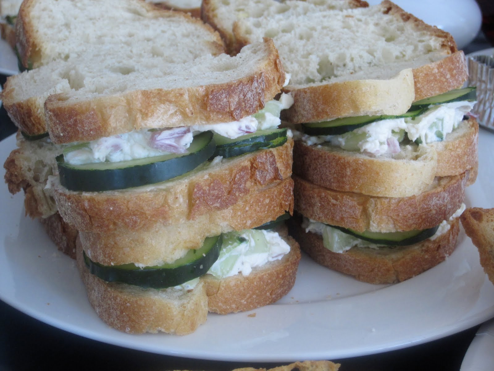 Cucumber sandwiches. These weren’t as dainty as the ones I envisioned — we used peasant bread, and that stuff is huge and hearty. We improvised the filling a little bit, but it turned out to be very tasty. These sandwiches were a hit!