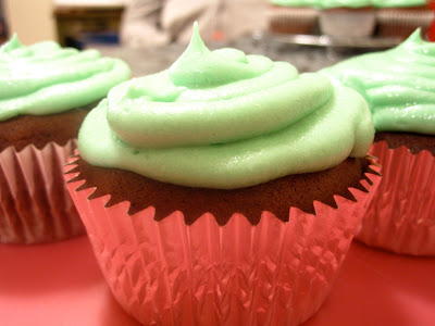 The most important part of this particular cupcake was the frosting. I mean, I can make chocolate cupcakes any day, but it’s St. Patty’s Day, so clearly the frosting had to be green. And since the frosting was green, that obviously meant it had to be mint-flavored.  This recipe made about 3 cups of frosting — way more than I needed for the cupcakes, so now I have a ziplock baggy fully of mint buttercream chilling in the freezer.