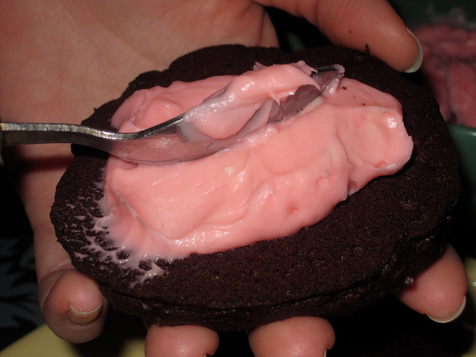 Somehow Emily and I missed the part of the recipe that said to “mix one large egg into the batter.” Guess we were a little too engrossed in our debate of the origin of the whoopie pie (See: “History of the Whoopie Pie”). Fortunately, the pies seemed to be unaffected by their lack of egg — they rose to puffy mounds as they were supposed to, and were soft, cake-y and delicious. Also, while I can’t attest to the tastiness of the original filling, I can tell you that these cakes were great with cream cheese frosting. Marshmallows vs. cream cheese? Can’t really lose either way.