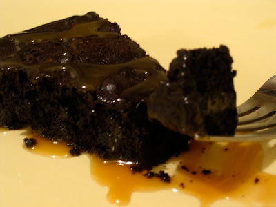 The cake was a success! Dense, rich, and intensely chocolate-y. Delicious by itself, but even better with a little caramel drizzled on top.