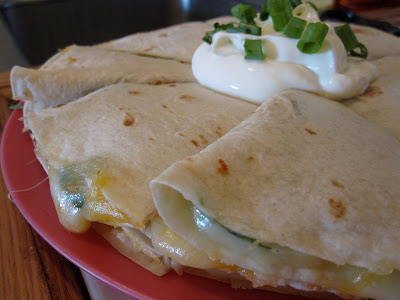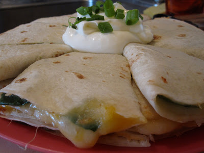 Not much to say about these quesadillas other than that they were delicious, and we all enjoyed them. The tortilla was just slightly toasty from the hot pan, the cheese was wonderfully melty, and the spinach was a nice foil for the rich cheese. Delicious with salsa and loads of guac and sour cream.