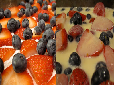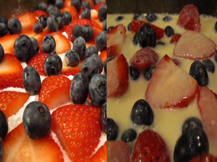 This recipe is very straight forward — a simple shortbread crust is covered with fresh fruit, then smothered with custard. Strawberries aren’t really in season now, but the ones on display at my grocery store looked pretty good, so I bought two cartons. In the end, three cups of sliced strawberries took too long to chop, and my hands got tired, so I just threw on a few handfuls of blueberries to supplement the missing fruit.