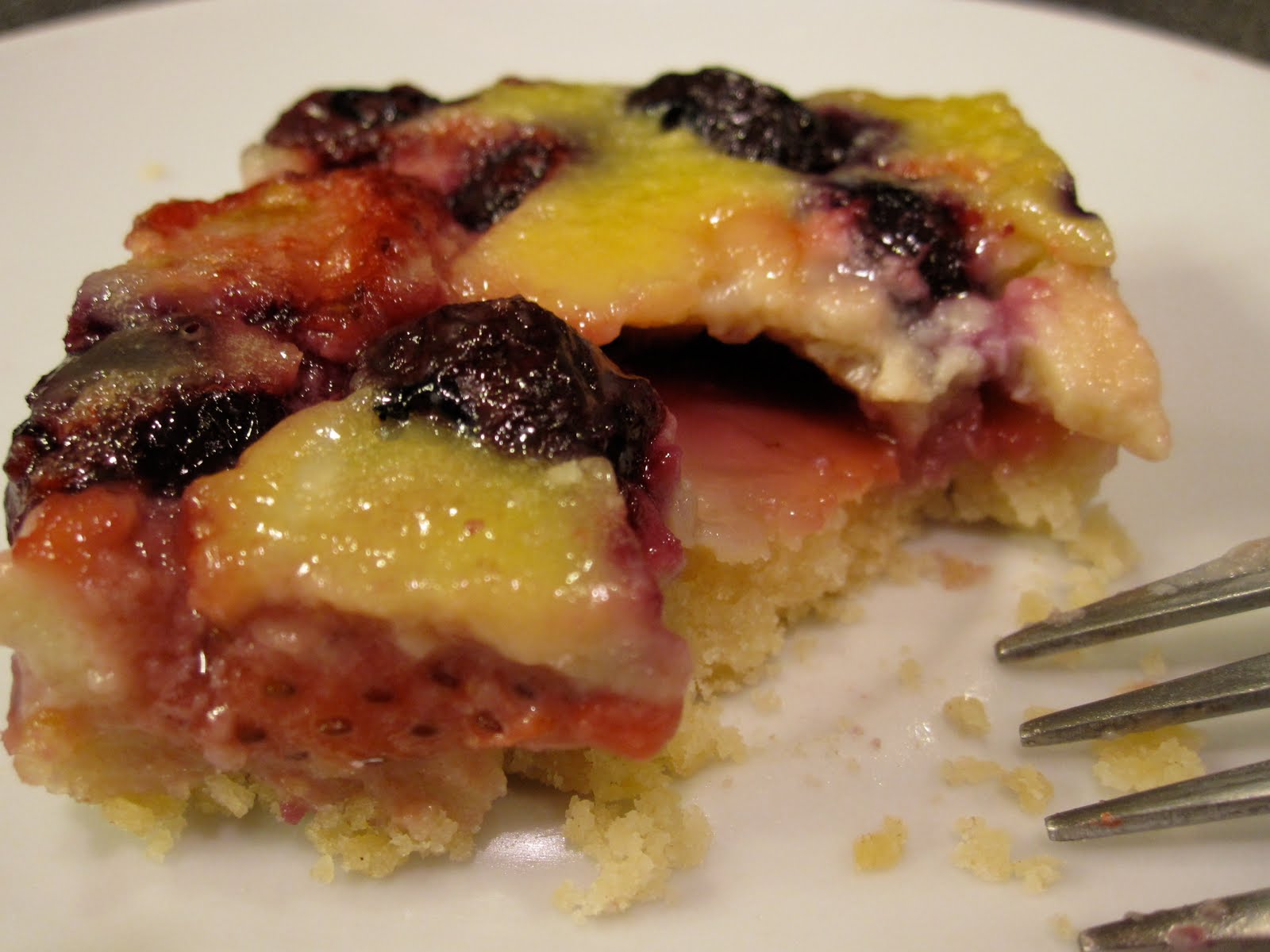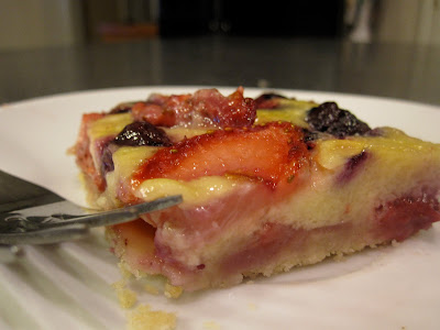 The resulting concoction tasted a bit like a cross between a pie and a fruit tart. The crust was buttery and crumbly, but less sweet than a regular shortbread; the fruit was explode-in-your-mouth juicy from cooking in the oven, and the custard was creamy and not overly sweet. Delicious!