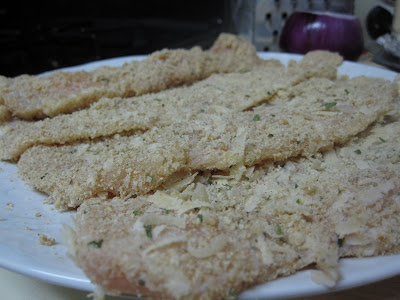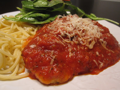 Because we ran out of eggs this weekend, and I only had panko breadcrumbs, I was originally just going to pan fry some chicken breasts, smother them in sauce and throw the whole thing into the oven for a while. Who says chicken in chicken parmesan has to be breaded? Imagine my delight when I discovered a canister of Italian-style breadcrumbs in the pantry and half a container of heavy cream in the fridge! In case you were wondering, cream with a dash of salt/pepper works just as well as eggs + milk when it comes to breading chicken.