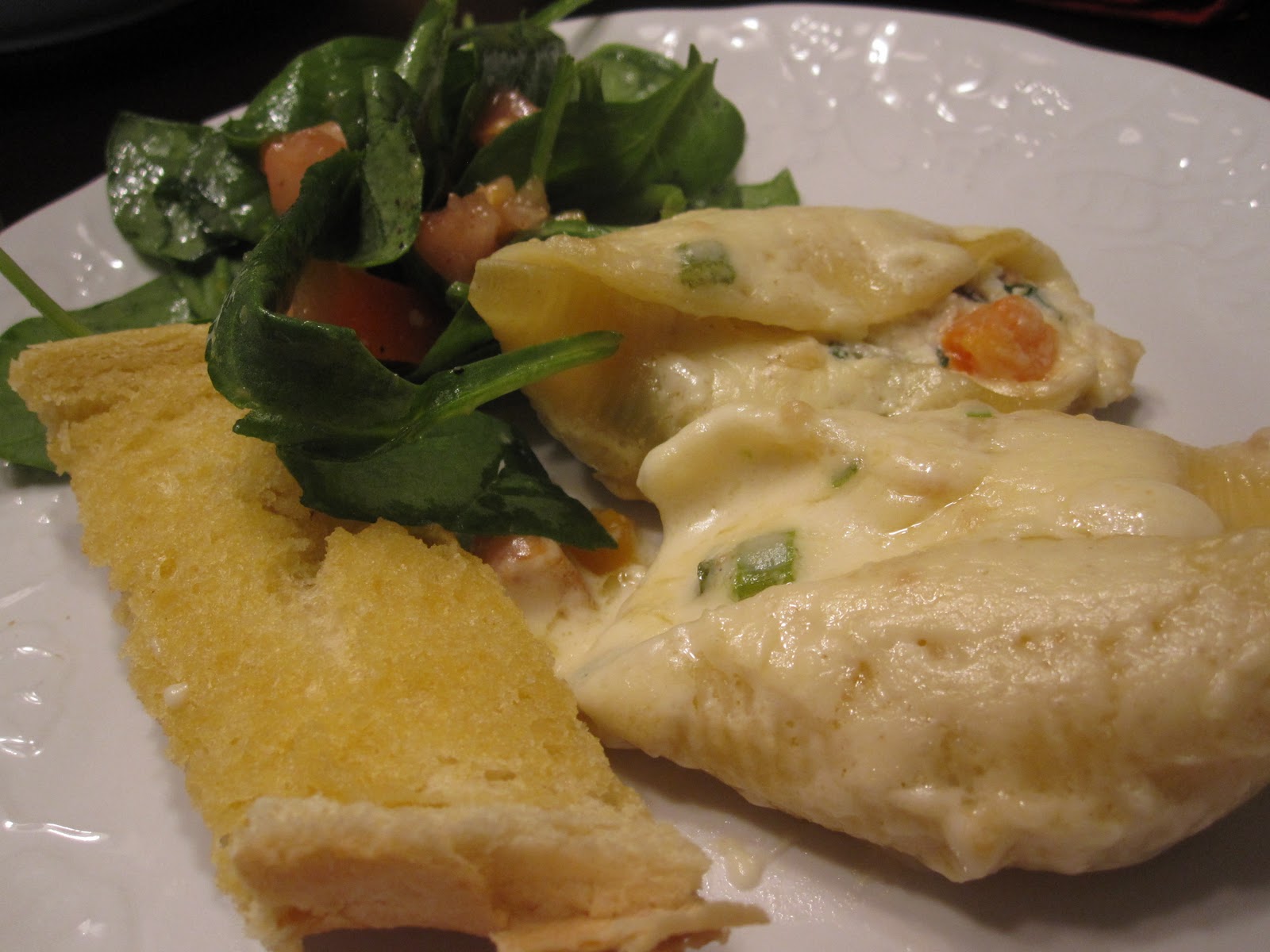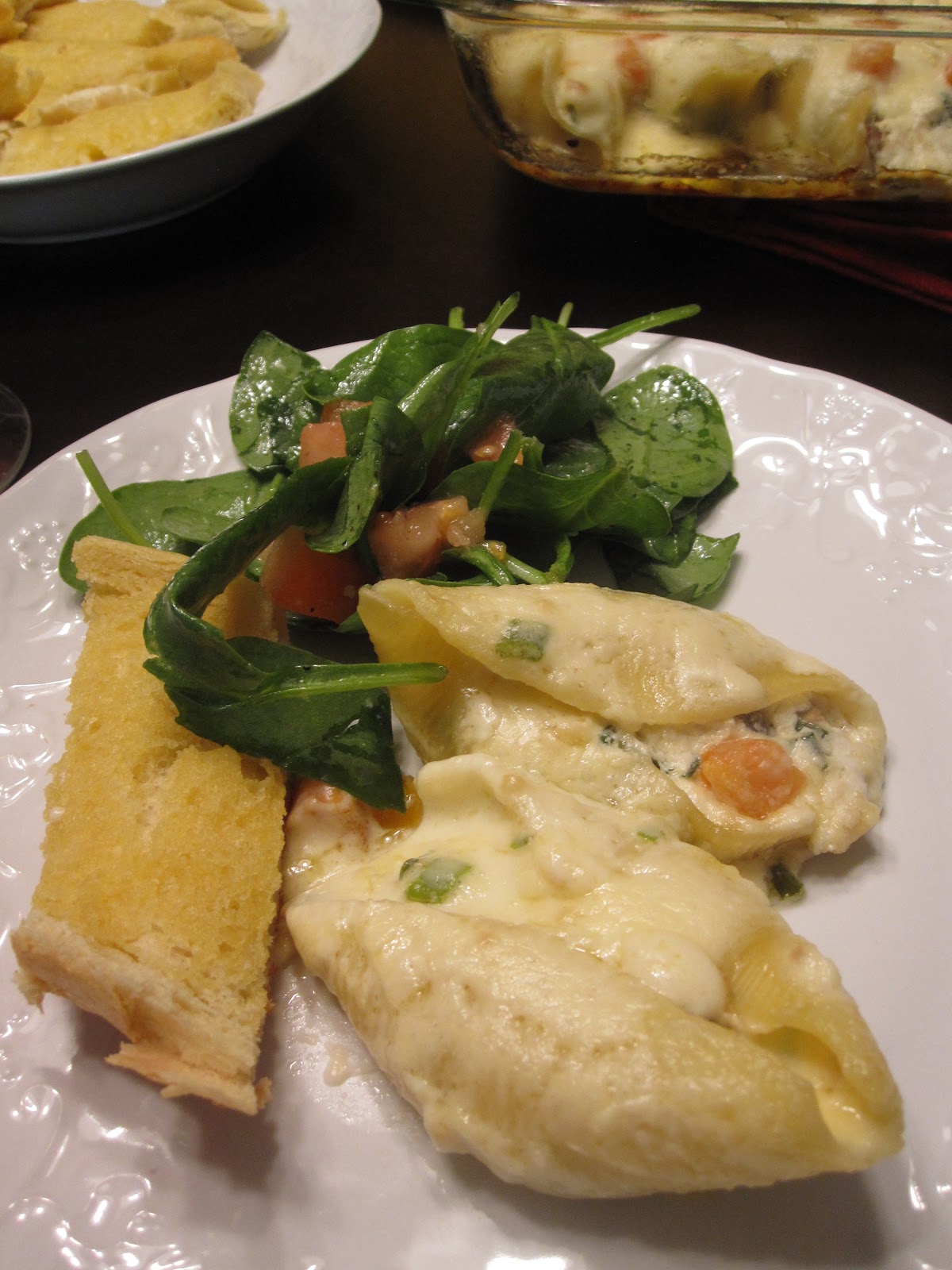 The pasta shells were stuffed and baked in less than an hour, smothered in cream sauce, and heartily enjoyed with garlic bread and glasses of wine. Delicious! (And even better cold the next day)