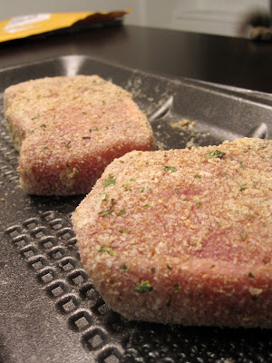 We’ve already had glazed, grilled chops two or three times in the last few months, and I felt it was time for a change. Closet Cooking was no help this time, because all of his recipes were a little more involved than I felt like dealing with at 7 o’clock on a Thursday night, and they called for a slew of ingredients I didn’t have on hand. Plus, I was tired of using the electric grill for our dinner meats. Lucky for us, I had all ingredients to make breaded, baked pork chops.