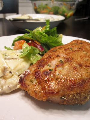 This wasn’t exactly a Rachel Ray-esque 30-minute meal, but the pork chops were very straightforward and easy to make. Both chops were seasoned, breaded, and browned in no time at all, and while they were baking in the oven, I had time to whip up a make-shift version of creamy au gratin potatoes, and sit down with a former DEA agent to answer a few quick back-ground investigation questions for Emily‘s new job. What can I say, I’m a multi-tasker.