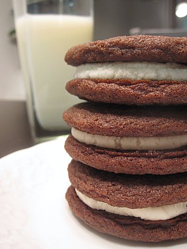 Anyway. These homemade Oreos are amazing! I thought they were going to be soft and chewy like Oreo Cakesters, but they really are exactly like regular Oreos…only better. The chocolate cookies themselves are crispy with just a hint of chew, and the vanilla cream filling (the best part of every cookie sandwich) is light and sweet, and not at all artificial-tasting. These would be perfect alone or…sigh…dunked into a tall glass of icy cold milk.