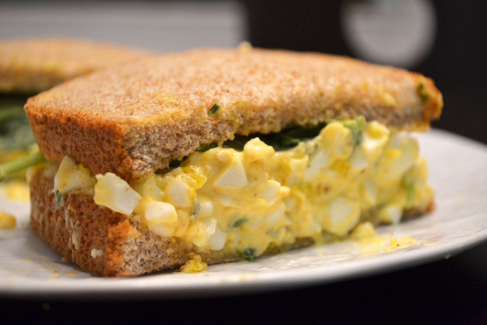 (5) Spoon heaping spoonfuls of egg salad onto a slice of bread. Layer lettuce or spinach on top. Cover with other slice of bread.