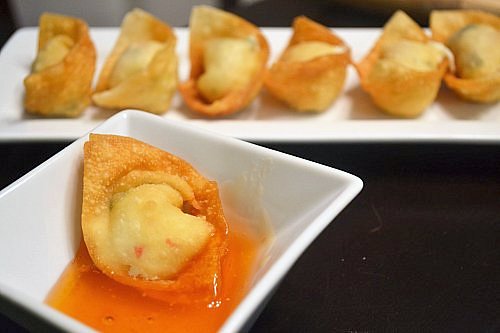 And fold those suckers into adorable little wonton shapes. Triangular rangoons are easier to make, but I love that these look like little ladies in bonnets.