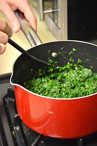 (3) Scoop all the spinach into the pot, and stir to allow the greens to soak up the garlicky butter, as well as break up any lumps in the spinach. Cook until liquid is released.