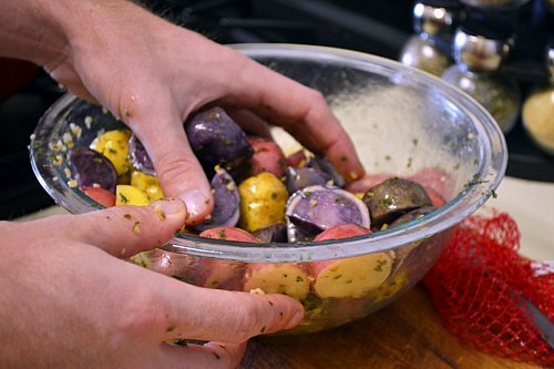 - Toss the potatoes in the olive oil mixture. (Tip from Dan: Really get your hands in there. You want to get olive oil on EVERYTHING.)