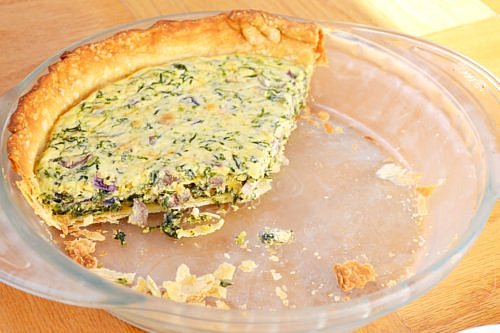 Anyway, after drooling over his baked goods for the last three years, I’ve been dying to cook with Mark. So, when he came over, I roped him into helping me make a quiche. In no time at all, we were rolling out our store-bought pie crust, cooking/chopping fresh spinach, sauteing mushrooms, and whipping up the creamy base for the quiche filling. We were like a well oiled machine, chatting and chopping and whisking. But, hey wait a minute…when did the pie crust go in the oven??? Eff. Turns out, we not only forgot to set a timer for the crust, but also failed to put in pie weights before baking. So yeah, it came out just a little burnt, and very shriveled. Oy. Thank god there was another crust in the package.